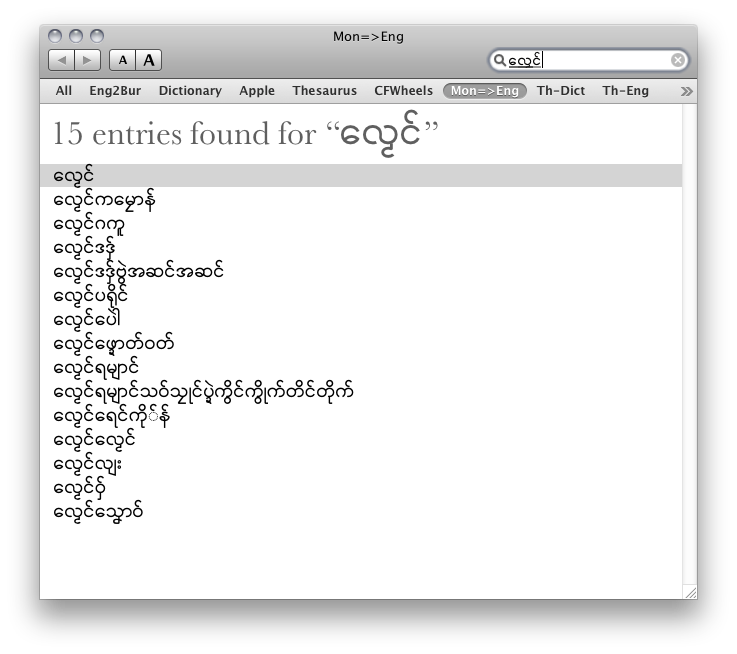 ပၞော်ကျာ – အဘိဓါန် မန်=>အၚ်္ဂလိက်ဏံဝွံ ပွံက်အဓိပ္ပဲါ နူမန်ဂှ် ကၠာဲပ္တိတ်ကဵု ဘာသာ အၚ်္ဂလိက်တိုက်ရိုက်မဒှ်ရ။ တၟေၚ်မွဲဂှ်အဘိဓါန်ဏံ သုၚ်စောဲ Multi OS ဂွံမဒှ်တုဲ ဇၟပ်ကောန်မန် ရပ်စပ်မံၚ် ကောန်ပျူတာ Window OS, Mac OS X, Linux တံဂှ် စုတ်တုဲ သုၚ်စောဲမာန်အိုတ်ရ။