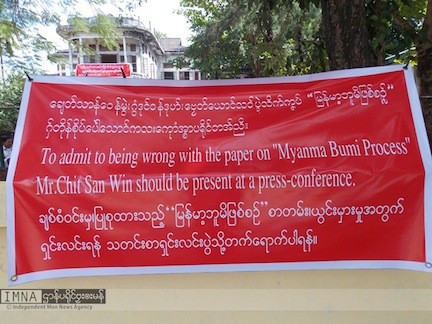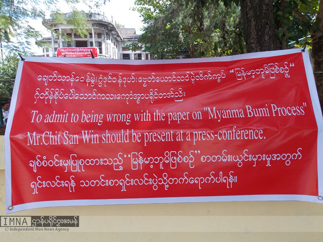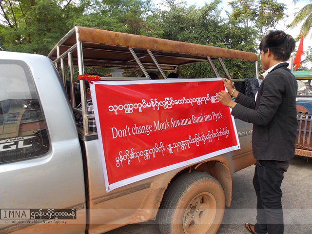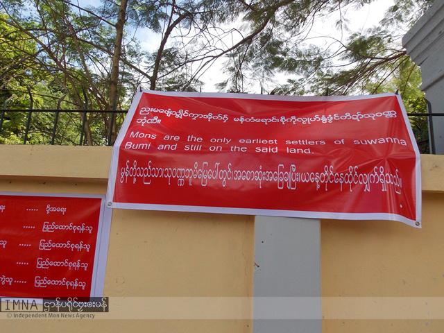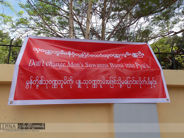 “ရှေ်သှေ်သ္ပဂရုအခေါၚ်အရာမၞိဟ်ညိ၊ ကေုာံဓရ်ညဳသာအပ္ဍဲဍုၚ်ညိ၊ သုဝဏ္ဏဘူမိမန်ဂှ် လ္ပပြံၚ်သ္ပထောံသုဝဏ္ဏဘူမိ ပျူညိ၊ ညးမဖျေံသ္ဇိုၚ်ကၠာအိုတ်ဂှ် မန်တံရောၚ် ဒဵုကဵုလၟုဟ်နွံမံၚ်တိဍာ်သုဝဏ္ဏဘုံဏီ၊ ချေတ်သာန်ဝေန်မွဲဂွံဒုၚ်ဝန်ဒုဟ် ဗၠေတ်ယောၚ်လဝ်ပ္ဍဲလိက်ကၞပ် “မြန်မာ့ဘူမိဖြစ်စဉ်”ဂှ် တိုန်စိုပ်ပေဲါသောၚ်ကလးအ္စာပရိုၚ်တံညိ၊ ညးမေဖျောန်ထောံဝၚ် နသာ်အရံၚ်ဟွံဍာံဂှ် ပိုဲဟွံမွဲပၟိက်၊ လ္ပလုက်စုက်ပကီုပရာပ် ဂုဏ်စရာဲကောန်ဍုၚ်အရၚ်တံညိ”သာ်ဝွံသီုမန်ဗၟာၜါဘာသာချူလဝ်တုဲ“ တိုင်းရင်းသားစည်းလုံးညီညွတ်ရေး – ဒို့ အရေး၊ တိုင်းရင်းသားဖိနှိပ်သူ – ပြည်ထောင်စုရန်သူ၊ တိုင်းရင်းသားအခွင့်အရေးကိုချိုးဖောက်သူ – ပြည်ထောင်စုရန်သူ၊ တိုင်းရင်းသားသမိုင်းဆေးဆိုးသူ – ပြည်ထောင်စုရန်သူ၊ တိုင်းရင်းသားစည်းလုံးညီညွတ်ရေး ဖြိုးခွဲသူ – ဒို့ရန်သူ”သာ်ဝွံ ချူကာတ်ဗါန်လဝ်ရ။