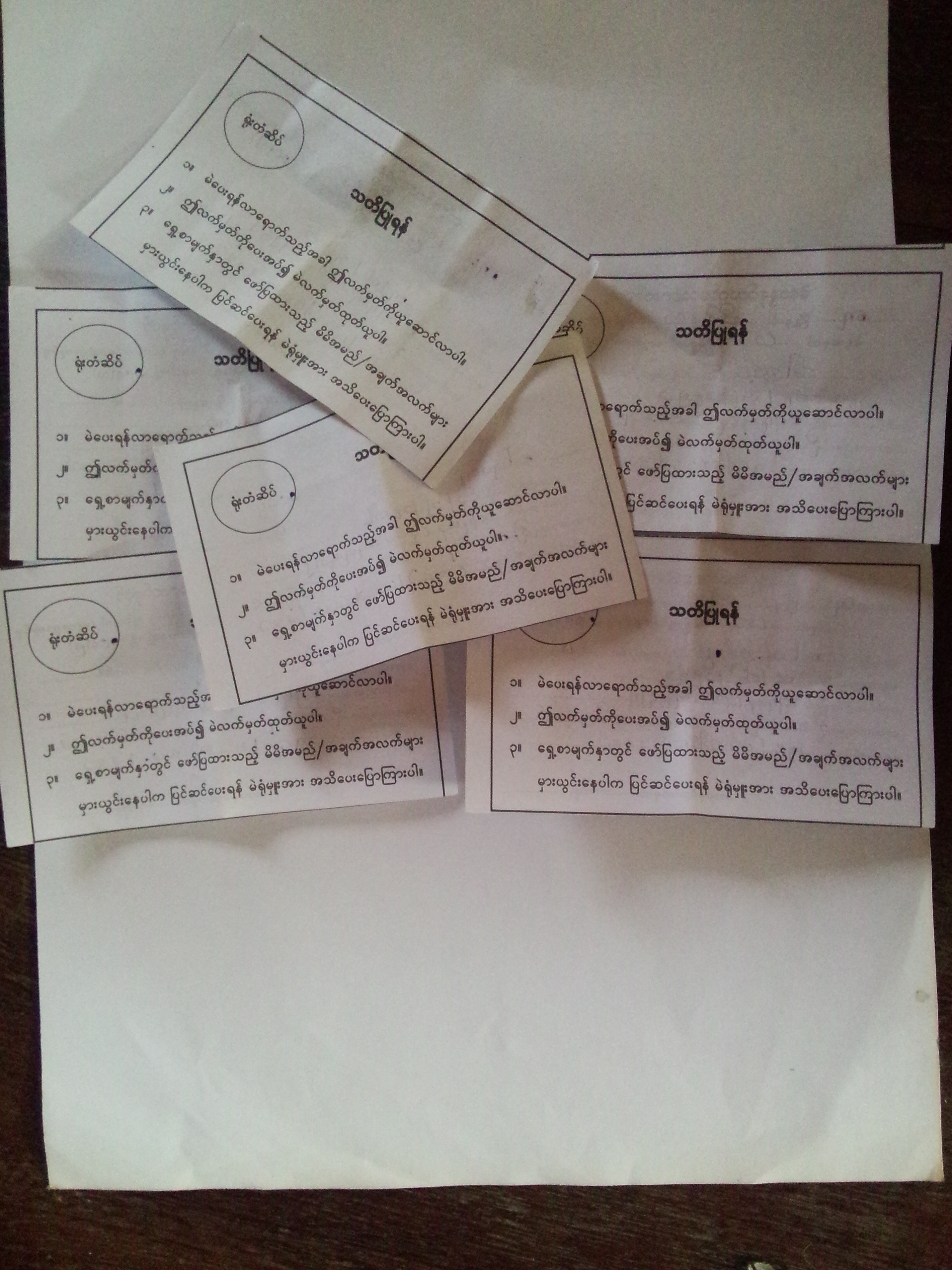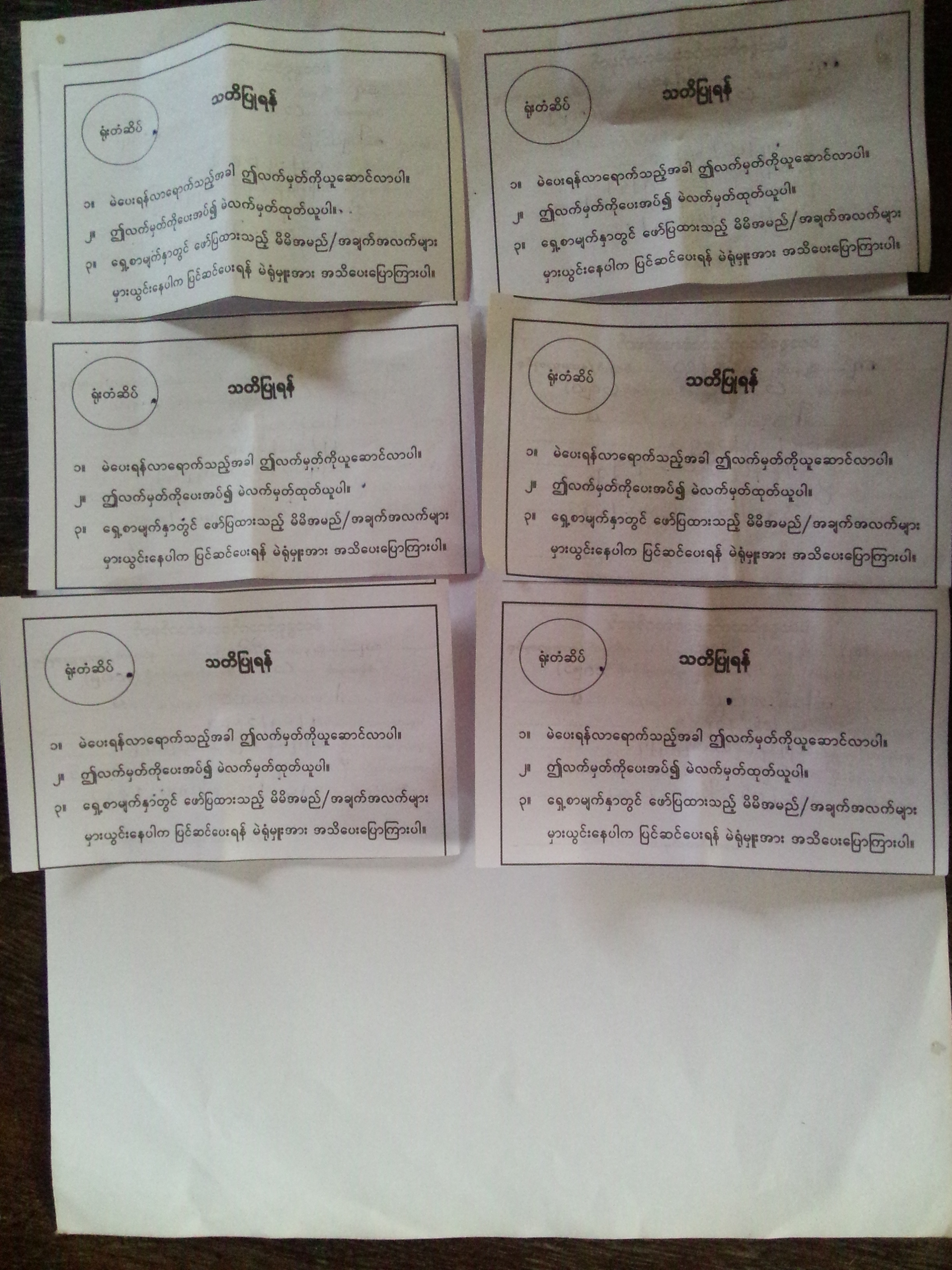 “လၟုဟ်ဍေံပတိတ်ကဵု (မဲဆန္ဒရှၚ်သက်သေခံလက်မှတ်) ယျ။ ဒၞာဲလ္ၚဵုဂှ် ဒးအာပတိတ်ကေတ်တ်၊ စိုပ်တေံ ဂွံဂၠာဲ ယၟုဇကုဂွံဂှ် တၟာကလှေ်မံၚ်၊ မၞိဟ်ယၟုဟွံပါဂှ် (မဲဆန္ဒရှၚ်သက်သေခံ လက်မှတ်) ဟွံမွဲပုဟ်။ ဣဏံဂှ် နဲကဲယဵုယဵု တပ်တပ်ဟွံသေၚ်ပုဟ်။ ဒးဒှ်ဓဝိၚ်ကွေံဏောၚ်။ ဖေက်ဒှ်အာ (ကြိုတၚ်မဲ)” သာ်ဝွံ နာဲကောန်ဆာန် ထပ်ဟီုရ။